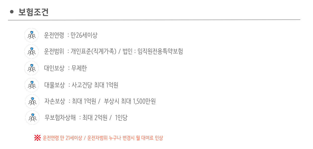 재직 임직원(계약직 포함) 보험처리 가능하며, 대인 무제한, 대물/자손 까지 보장됩니다.